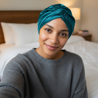 Simply gather your hair, slip the Nyria bonnet on from front to back, and gently adjust the tie for a snug, comfortable fit. In less than 10 seconds, your hair is protected for a perfect morning.