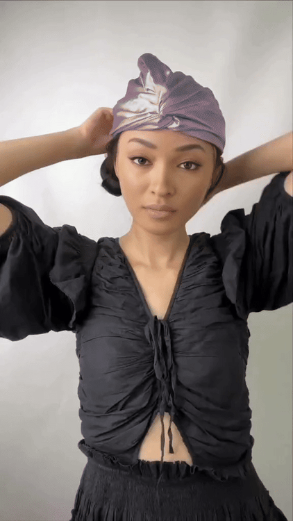 Getting flawless hair couldn't be easier. Simply gather your hair—whether it’s in braids, curls, or a fresh blowout—and tuck it into the bonnet. Adjust the tie for a secure fit that feels just right, and let the Nyria work its magic while you get your beauty sleep.
